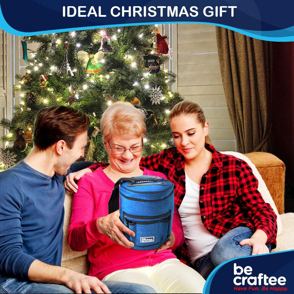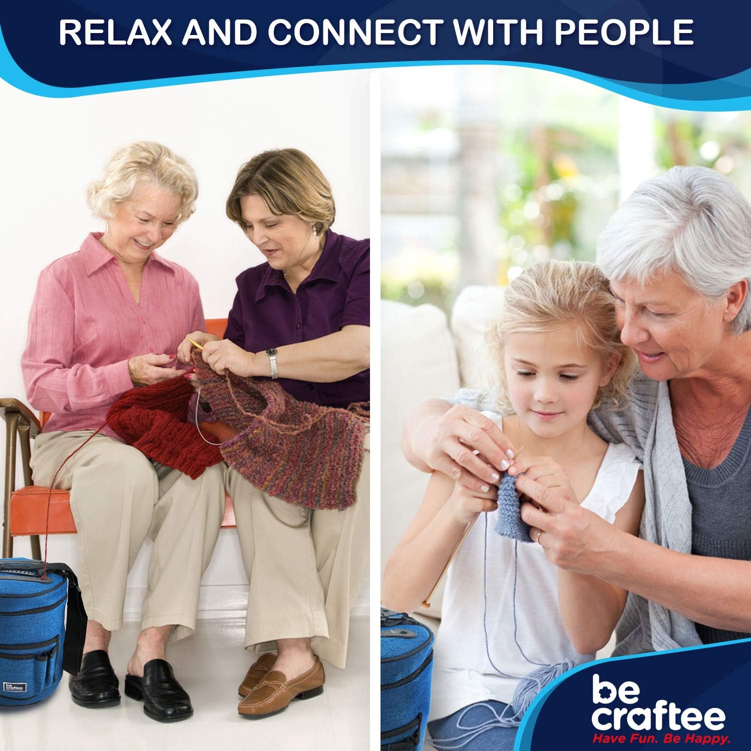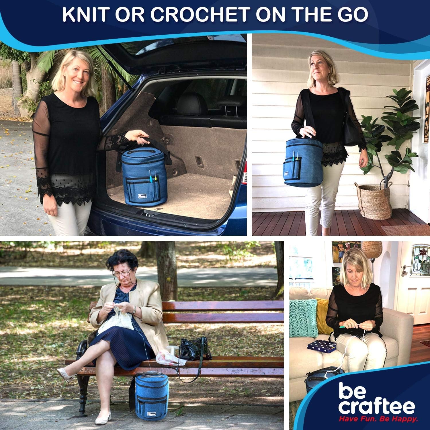 BeCraftee XL Crochet Bag – Large Yarn & Tool Organizer, 7 Pockets, Shoulder Strap, Blue