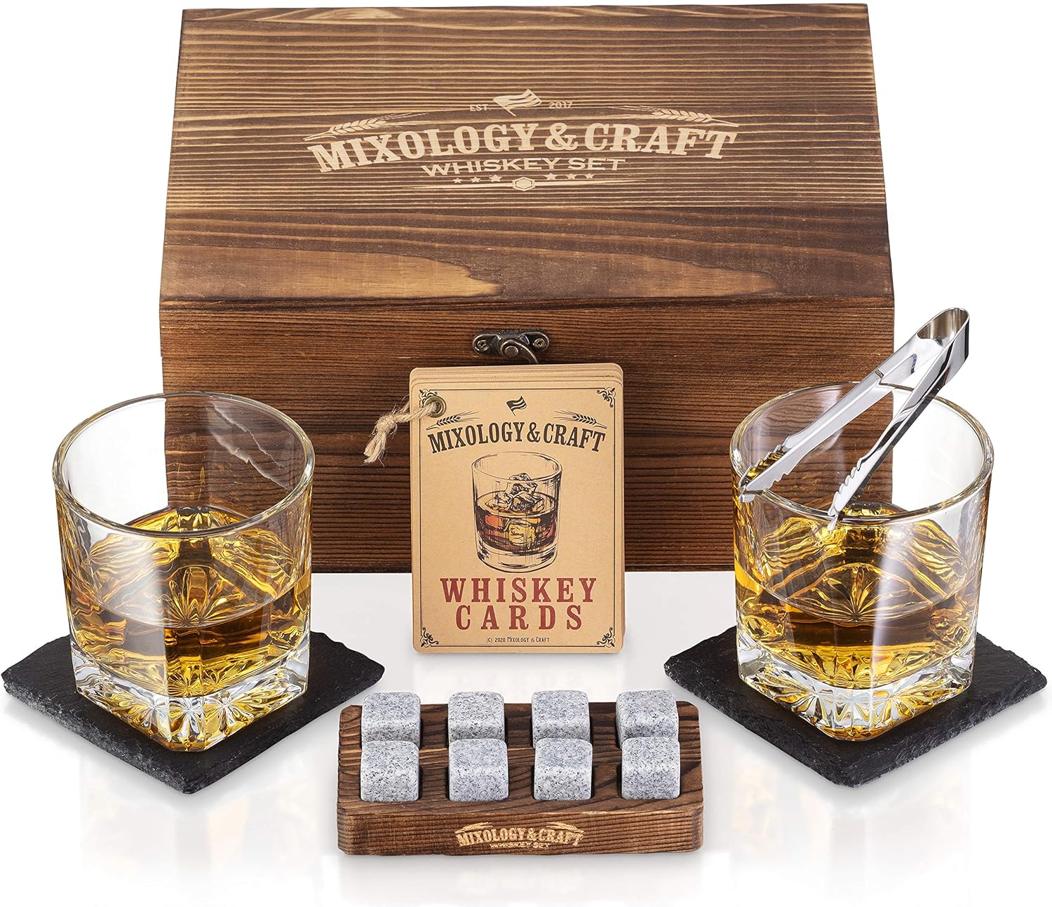 Mixology Whiskey Stones Gift Set for Men, 2 x 10oz Glasses, 8 Granite Chilling Rocks, 2 Coasters, Metal Tong & Cocktail Cards in Wooden Box