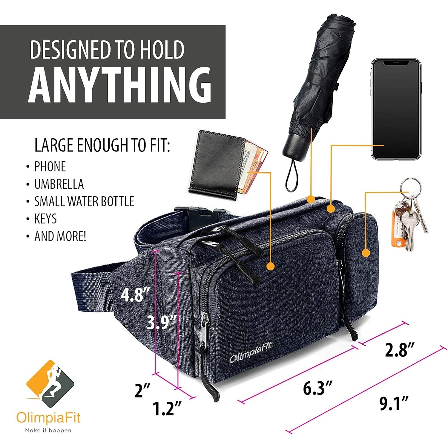- PERFECT ON THE GO ACCESSORY: Ultra-lightweight comfortable waist pack will keep your hands & pockets free! fanny bag fits everything you need inside & organized. Ideal anti-theft waist bag with hidden pockets. Keep your essentials at arms length and valuables safe when travelling, shopping, at theme parks, fairs, festivals, concerts. Great for running chores, dog walking, camping and all workouts (cycling, jogging, hiking). Simple fashionable design looks stylish with any outfit.