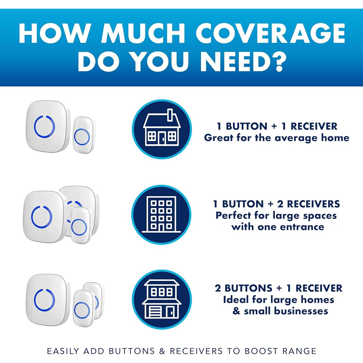 With our wireless doorbell kit, easily add loud (or silent) alerts anywhere in seconds. Each door bell kit receiver covers 600 ft (183 m) with durable construction and the ability to add more door bell push buttons and receivers to expand your system. Have multiple entry points? Each doorbell kit receiver can play its own tone to indicate which door has a visitor.